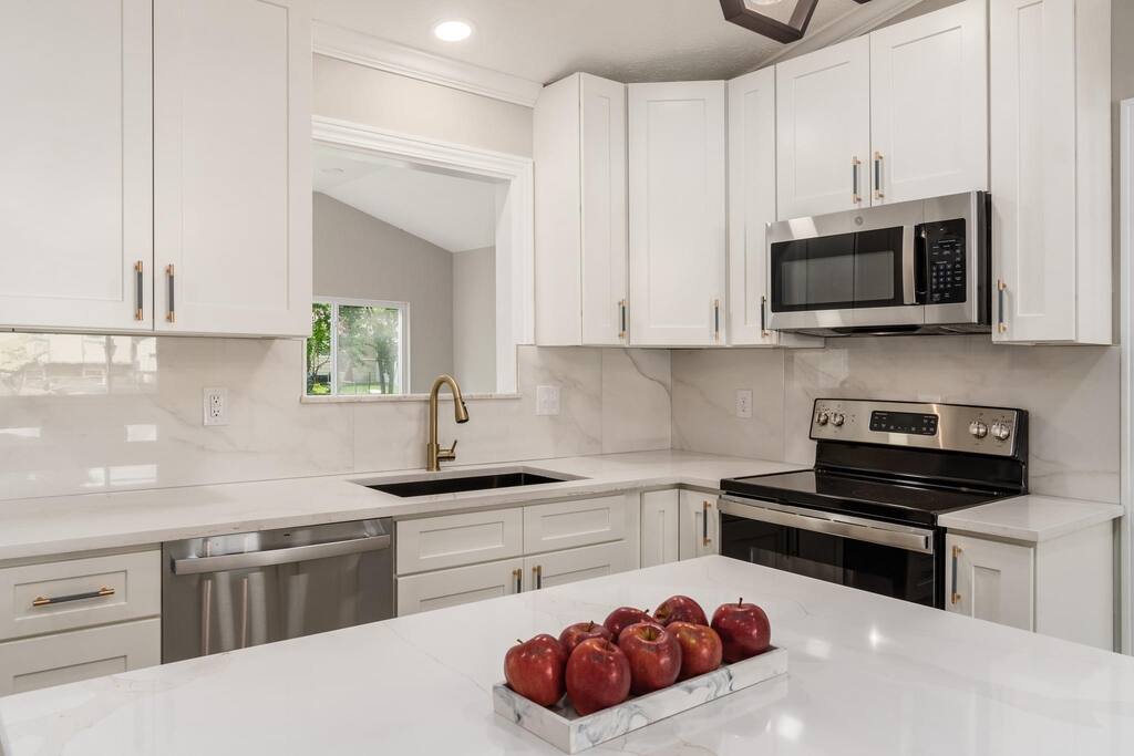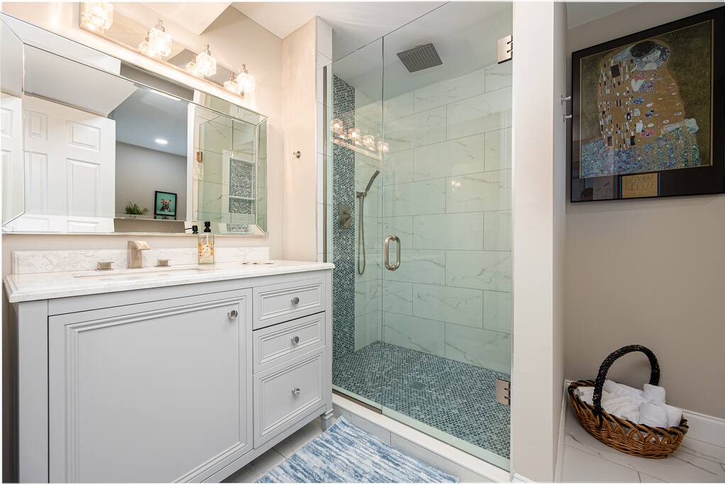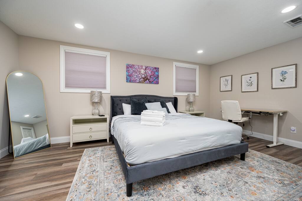As you step inside, you will be immersed in contemporary elegance and surrounded by natural light that fills this open concept living space. A well-appointed kitchen and dining area create a cozy atmosphere for relaxation or entertainment. The kitchen is fully stocked and ready for your culinary adventures. In the morning, enjoy a hot espresso (or two). In the evening, you will have all the tools you need to prepare a delicious home-cooked meal. Gather around the dining table to share good food and great company- or, if you prefer outdoor dining, step out onto the patio, and enjoy a meal al fresco. Stream your favorite shows or movies from two smart TVs and stay connected with high-speed internet throughout the property. For those balancing work and play, you will have a dedicated office space where you can catch up on emails or attend virtual meetings in a comfortable and productive environment. You and your guests are assured a restful night’s sleep with ample sleeping arrangements and four bedrooms boasting plush linens and pillows. The bathrooms feature upgraded fixtures and ample counter space, and the marble tile shower offers the ultimate spa-like retreat.